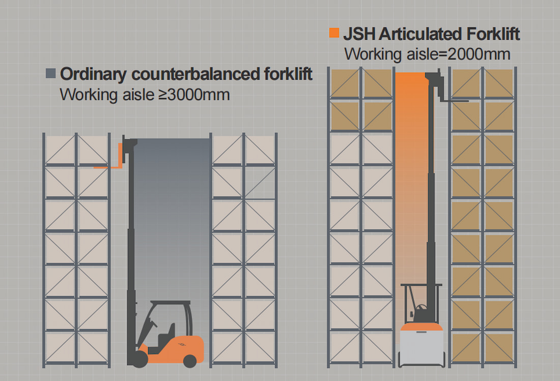 Номинальная грузоподъемность составляет 2,0 тонны, максимальная высота подъема — 12,5 м, а специальная система управления портальным краном делает вилочные погрузчики серии JSH более маневренными при работе в узких проходах. Минимальная ширина рабочего прохода составляет всего 2 метра, что позволяет сэкономить пространство для складских работников.