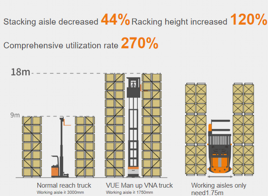 Новое поколение VUE может похвастаться впечатляющей максимальной высотой подъема в 18 м и максимальной грузоподъемностью в 1600 кг. Сверхузкий проход шириной 1,75 м значительно увеличивает эффективность использования складского пространства, делая его еще более выгодным.