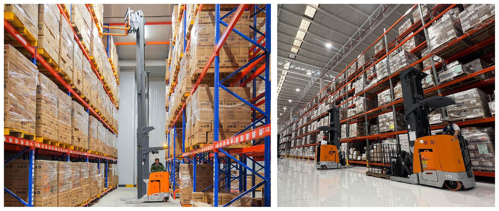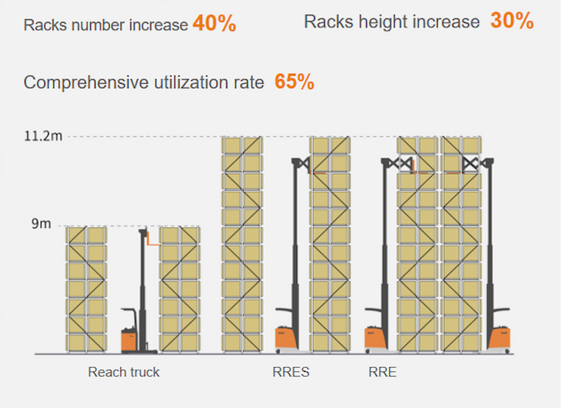 Количество стеллажей на единицу площади значительно увеличилось, что обеспечивает больше места для поддонов и способствует повышению эффективности хранения по сравнению с обычными вилочными погрузчиками.