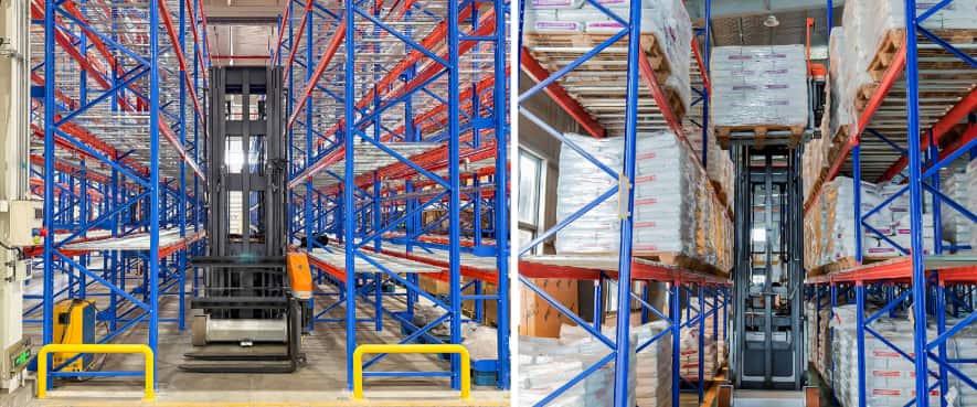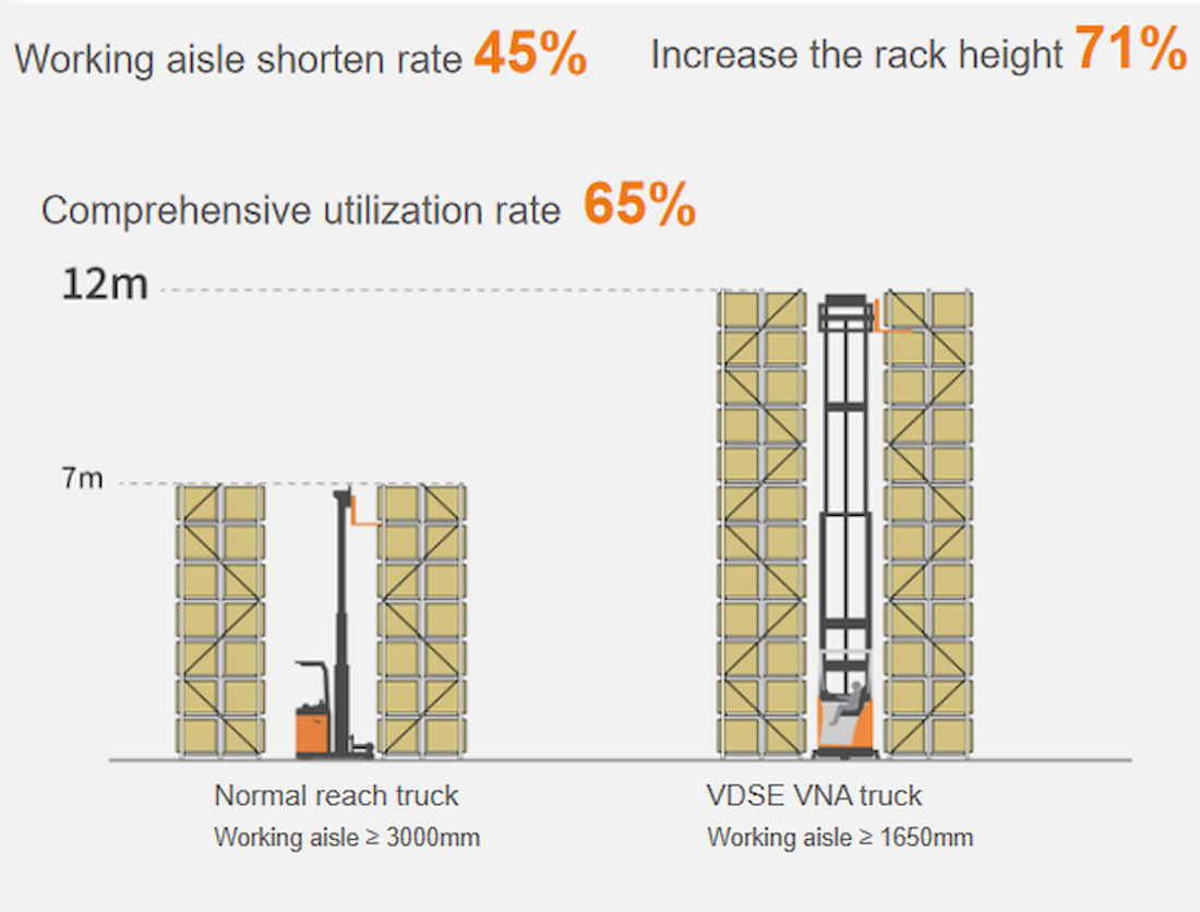 Благодаря рабочему проходу шириной 1650 мм и центру тяжести 600 мм, он легко справляется с различными ситуациями штабелирования. Оснащенный электрическими поворотными вилами на 180°, модель VDSE значительно упрощает комплектацию и размещение грузов.